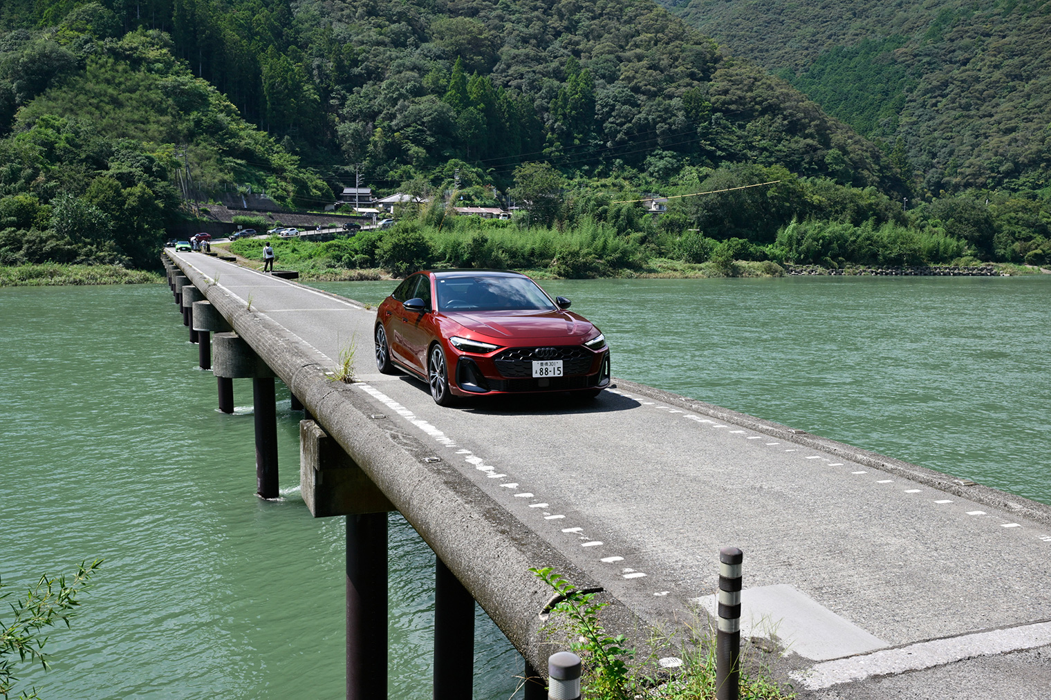 高知龍馬空港での開会式後から早速ステアリングを握っていただきました。スタート直後は市街地と高速道路を走行して、今も住民の方の生活道として、使用されながらも風情ある雰囲気が魅力的な「名越屋沈下橋」へ。車窓からでも分かる仁淀川の美しい川面をご覧いただきながら、橋を渡っていただきました。