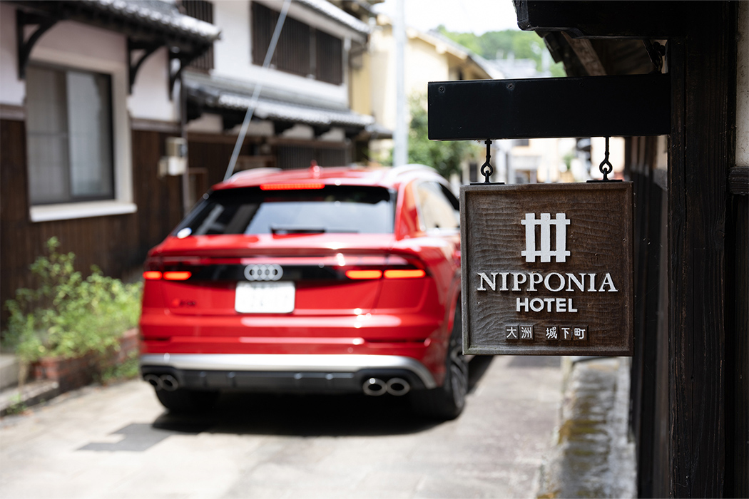 石鑓山を下り、今回の宿泊地「瀬戸内リトリート青凪 by 温故知新」へ向かいます。山道を抜けると、交通量の多い市街地を走行しましたが、Audiはワインディングロードやオフロードの走行だけでなく、市街地での快適なドライブも楽しんでいただけます。先行車に合わせて減速や制動を行い、自動で車間距離をキープして走行するアダプティブクルーズコントロール(ACC)は、渋滞時に減速や制動を行い、先行車が停止した際には停車まで自動で行い、安全な走行はもちろん、ドライバーの疲労軽減にも役立ちます。市街地を抜けると程なくして、「瀬戸内リトリート青凪」に到着。日没のマジックアワーとタイミングが重なり、瀬戸内海に映るサンセットを望みながら、1日目のツーリングは終了しました。