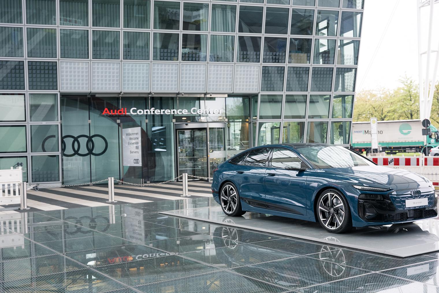 建物入り口に鎮座する新型Audi S6 e-tron。