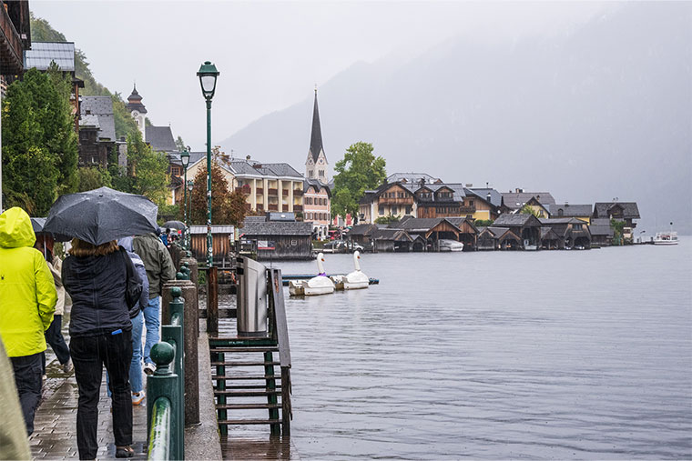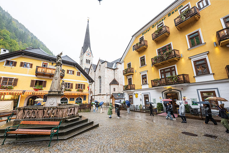 雨で霞む標高の高い山々を車窓から眺めながら約2時間走ると、「真珠」にたとえられるほど美しいハルシュタット湖畔の町に到着しました。雨で山々はかすんでいましたが、美しく保存された街並みに皆さま感動し、記念写真をたくさん撮影されていました。