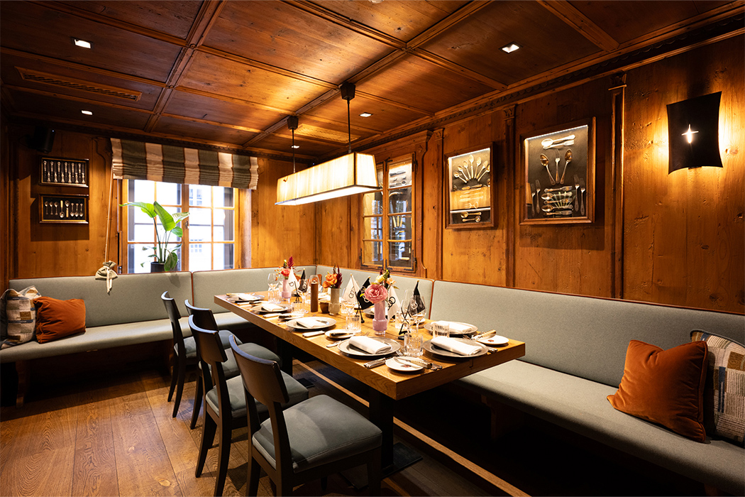 『KÄFER』そのものが、ミュンヘンの上流文化・社交界を象徴する存在で、同市では「伝統ある老舗」として位置づけられています。建物は個性的な19の個室で構成されており、日本からのお客様のために用意された部屋は『BESTECKSTUBE(カトラリー)』と名付けられています。銀や象牙のカトラリーなど貴重な品々は、往時の食卓文化を今に伝えるもので、本物の『KÄFER』の伝統を特別なお客様に体験していただきたいという配慮のもと、用意された部屋でした。