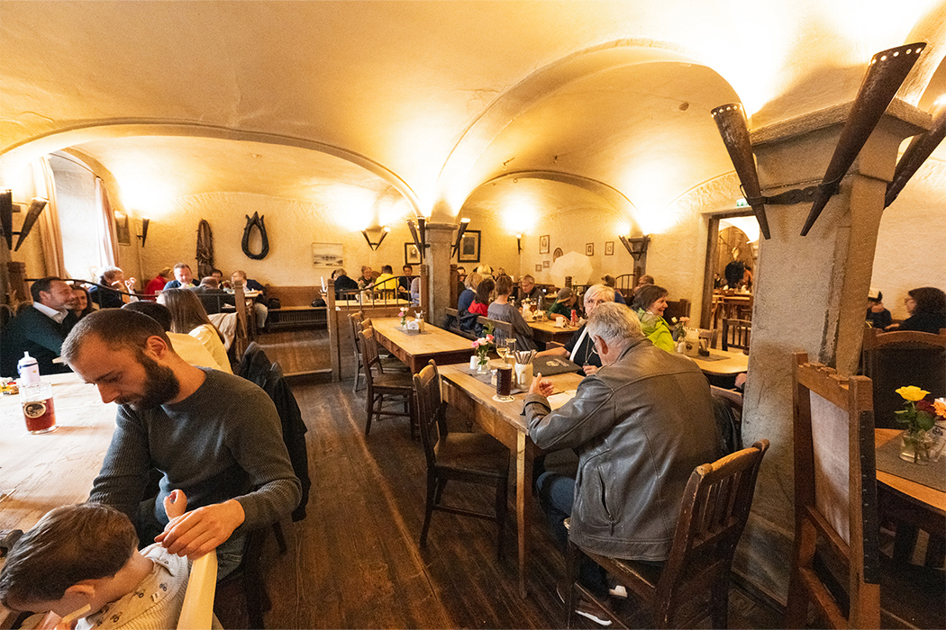 途中、ドイツらしい景色を車窓から楽しみながら到着したランチ会場は『Gasthof Hotel Hirzinger』。1477年の「ホーエナシャウ領地」の古い記録に「Wirth von Selhueben(カゼルヒューベンの宿屋主人)」として初めて登場して以来、500年以上にわたり家族経営を続けている希少な宿です。併設されたレストランは約100年前に設けられ、旅の醍醐味である郷土料理を提供しています。顔より大きな「Wiener Schnitzel」の登場に、皆さまも思わず感嘆の声を上げていらっしゃいました。