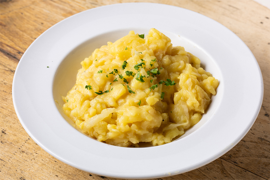 一見リゾットのように見えましたが、シュニッツェルの添え物として提供されたのはポテトサラダでした。日本の居酒屋などで見られるものとは少し異なり、ジャガイモに塩とビネガーを合わせた、さっぱりとした味わいのお料理です。こちらも特に女性に人気の高い一品でした。