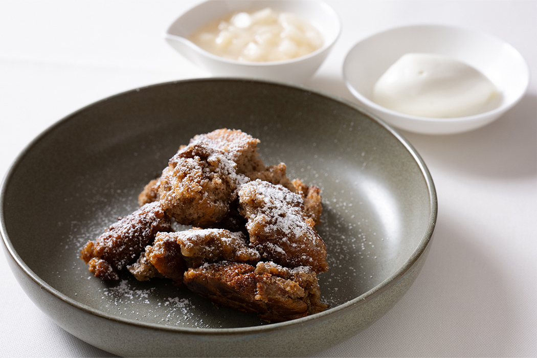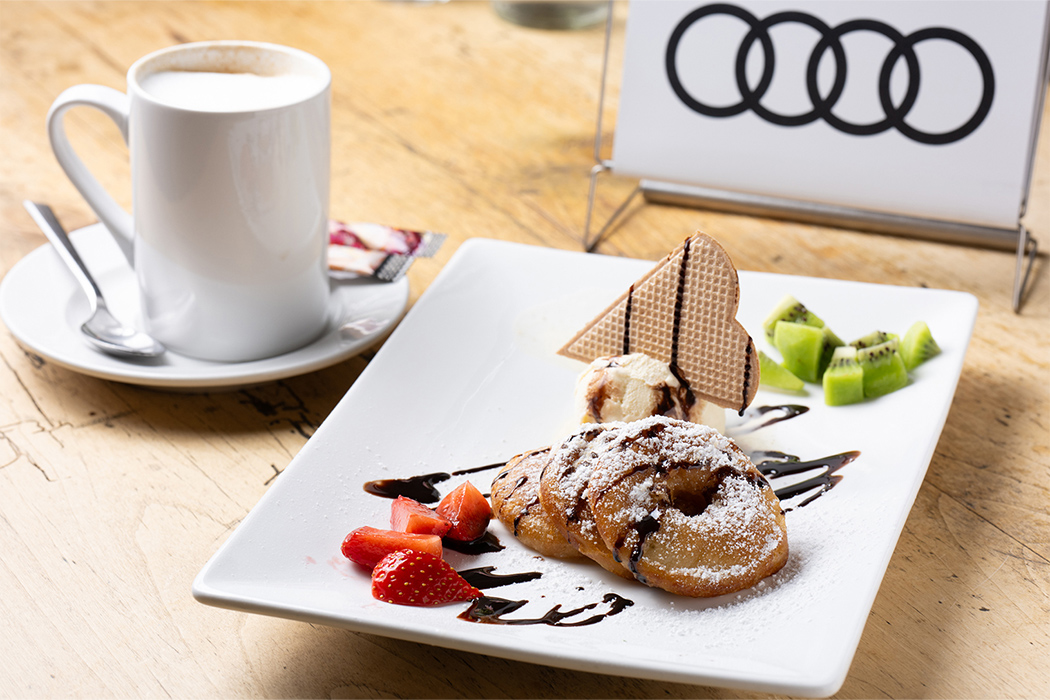 Audiグランドツアーの特別メニューの締めは「Apfelküchle(アプフェルキューヒレ)」のバニラアイスクリーム添え。18世紀初めに傷み始めたりんごを美味しく食べる庶民の知恵として生まれた料理。今では国境を超えて愛されている。
