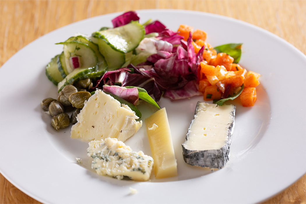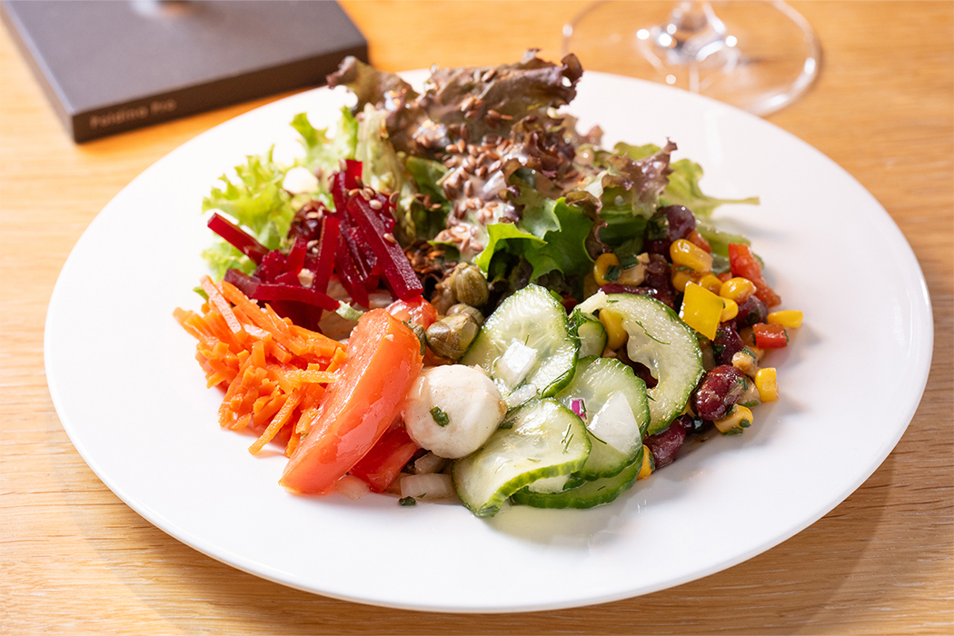 きゅうりなどの冷菜をクルーセル状に敷き詰め、その上に塩と燻製で味付けしたブリをのせた一品です。バイエルン地方の郷土料理には生魚はほとんどありませんが、日本人向けにアレンジされたフュージョン料理のひとつで、食べやすく日本人の口にもよく合う一品でした。