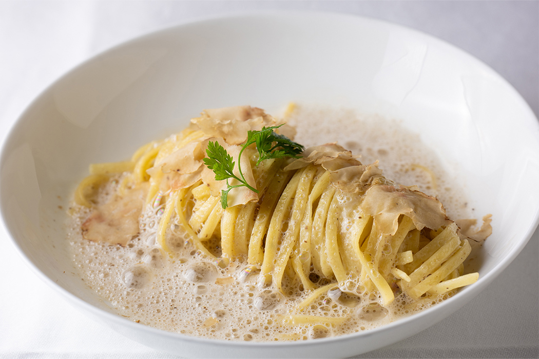 『生パスタのリングイネ ポルチーニのクリームソース白トリュフがけ』