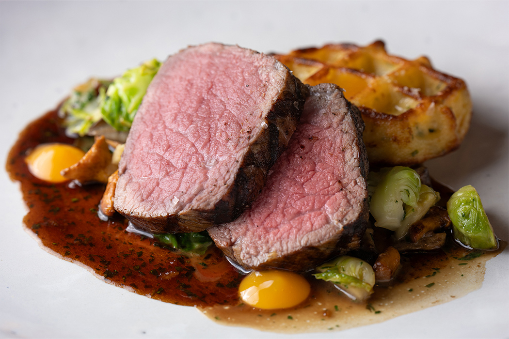 バイエルン地方原産のゲルプフィー種を使ったステーキ。赤身と脂身のバランスが良く、ジューシーでステーキに最適な肉質を持っています。添え物には、郷土料理の『ブラートカルトッフェルン』をワッフル型で香ばしく焼いたものが添えられていました。