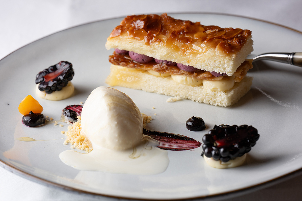 デザートは、ココナッツとパンナコッタ、サワーチェリーを使った一品。ベリークリームとカスタードクリームが、ダックワーズのような生地の中にサンドされています。