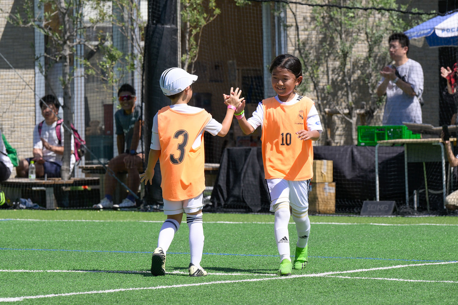 レクリエーションの後は、3チームがそれぞれさらに2チームに分かれ、計6チームによる総当たり戦が始まりました。試合中は夢中になって走り、ボールを蹴り、勝利をひたむきに目指すお子様たちですが、試合が終わるとコーチ陣から「リスペクトタッチ!」の声がかかり、お互いの健闘を称えて手を合わせます。勝敗にこだわりつつも、仲間とサッカーをプレイする楽しさを心から感じ、チームメイトや対戦相手など他者をリスペクトすることの大切さもしっかりと学ぶ姿がそこにはありました。