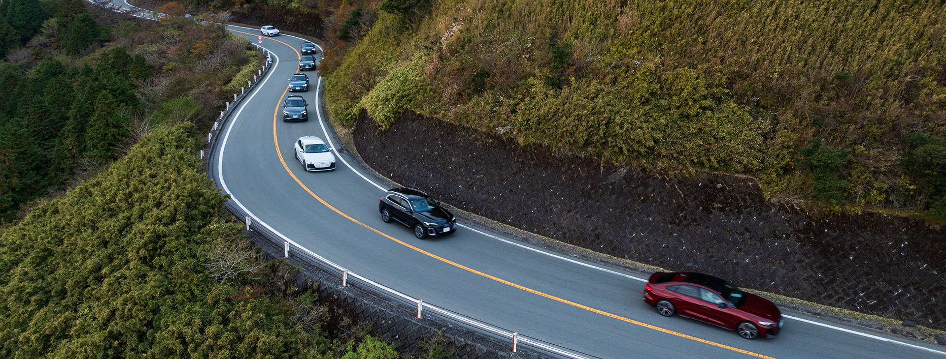 Audi A5、Audi Q5、Audi A6 e-tron、Audi Q6 e-tronの4モデルをご用意して、箱根エリアを中心としたワインディング、高速道路や市街地など様々なシチュエーションを設定しました。