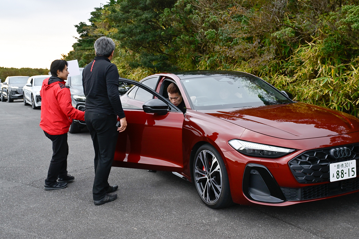 どちらのスカイラインも、適度なアップダウンとバラエティ豊かなコーナリングがあり、走り応えのあるドライブコースで、Audi A5、 Q5、Q6 e-tronに搭載されたパワーステアリングのアシスト力を速度に合わせて調整する「プログレッシブステアリング」によるダイナミックかつスポーティな操舵や、コンパクトでパワフルな電気モーター1基をリヤアクスルに搭載して後輪を駆動するAudi A6 e-tronの力強く途切れのない加速と低重心のボディバランスで路面に吸い付くかのような安定したドライビングを体感いただきました。
