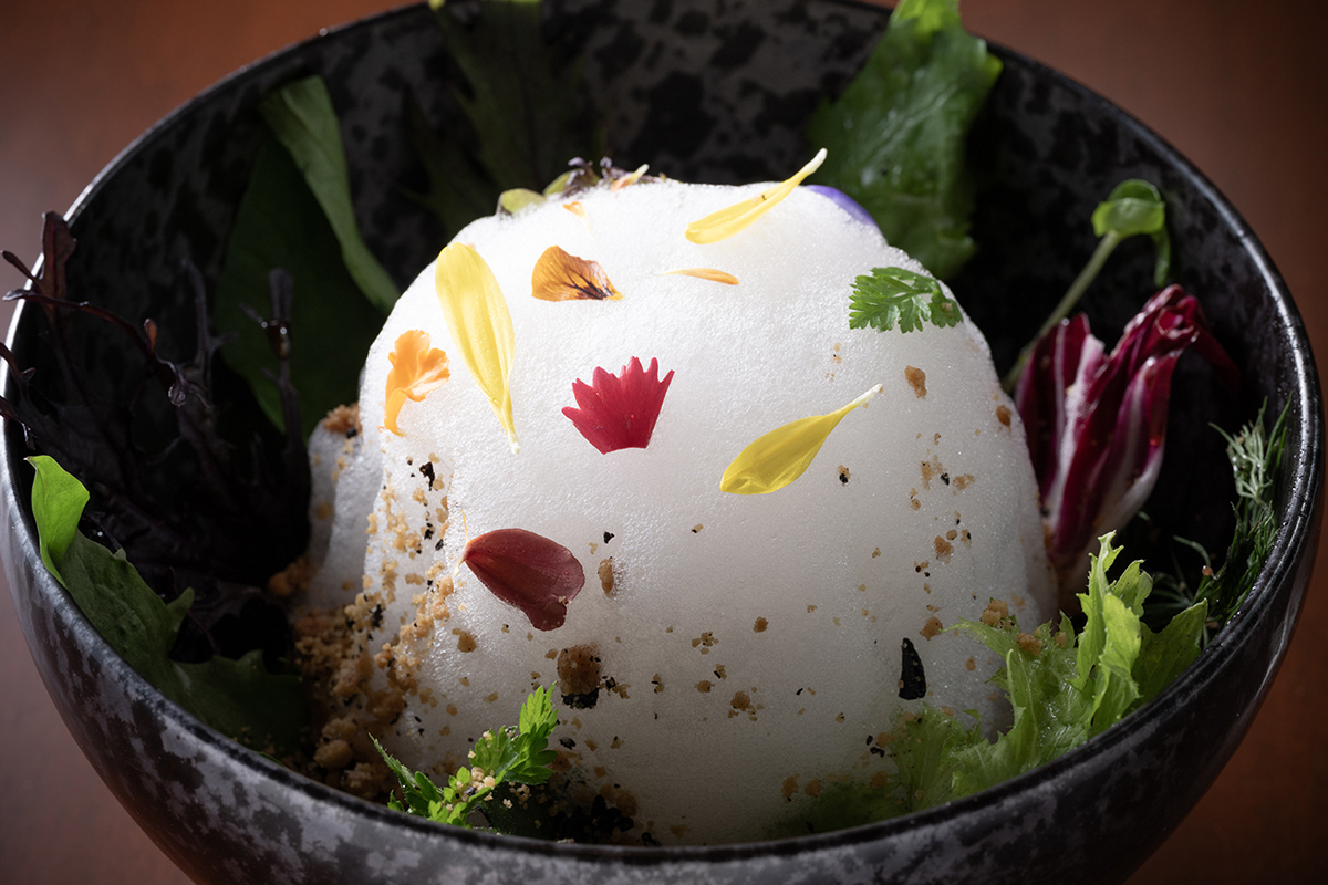 1品目は、梅のソルベなど、一口サイズながら、創造性豊かなアミューズ。次の料理への期待がより一層高まるシェフのこだわり、工夫の詰まった一品でした。続く、2品目は、レモンソースの白い泡が印象的な「庭園風季節のサラダ」。泡の下には、3種のソースと静岡県産をメインとした30種類以上の野菜、燻製されたマスなど多くの食材を使用。食べる際に、泡やソース、食材をすべてよく混ぜ合わせます。斬新な見た目に加え、複雑な味わいに、皆様驚かれていました。