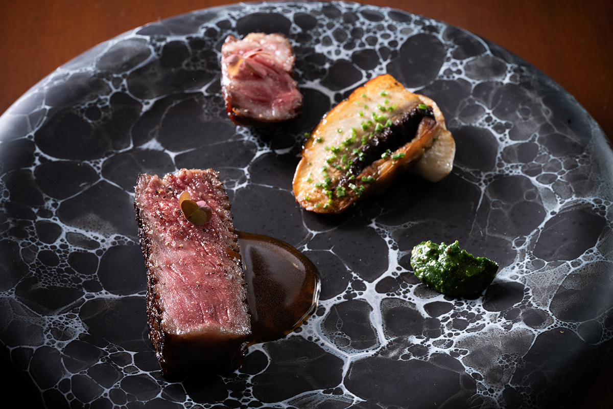 3品目の「ジャガイモのニョッキ パルメザンのソース トリュフ」は、ジャガイモの甘みが感じられるニョッキに、濃厚なチーズソースとトリュフの芳醇な香りが重なり、口の中に心地の良い余韻の残る一皿。メインは、「紡ぎ和牛ステーキ」。卓越した火入れ技術で、口の中に入れた瞬間に溢れ出す肉の旨味とソースの絶妙な調和に思わず舌を巻きました。添えられたクレソンのコンディモンをつけると、香り豊かでピリッとした刺激が加わり、違った味わいの楽しさを堪能できました。