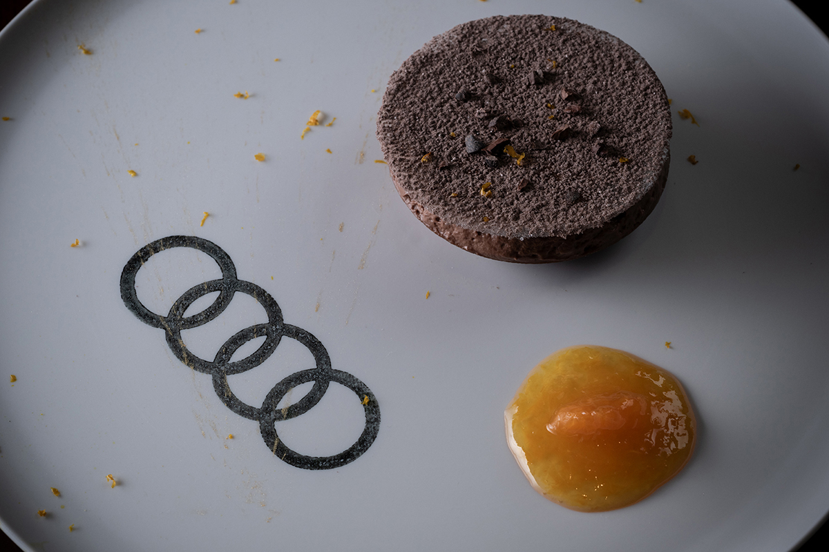 コースの最後の一品、「チョコレートタルト みかん」は、濃密なカカオの味わいに、みかんの爽やかな酸味が合わさり、濃厚ながら軽やかな後味で、コースを華やかに締めくくるデザートでした。