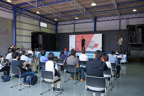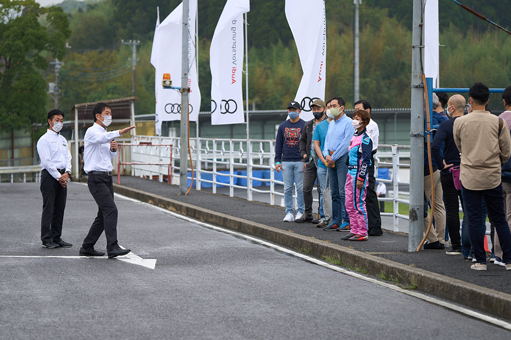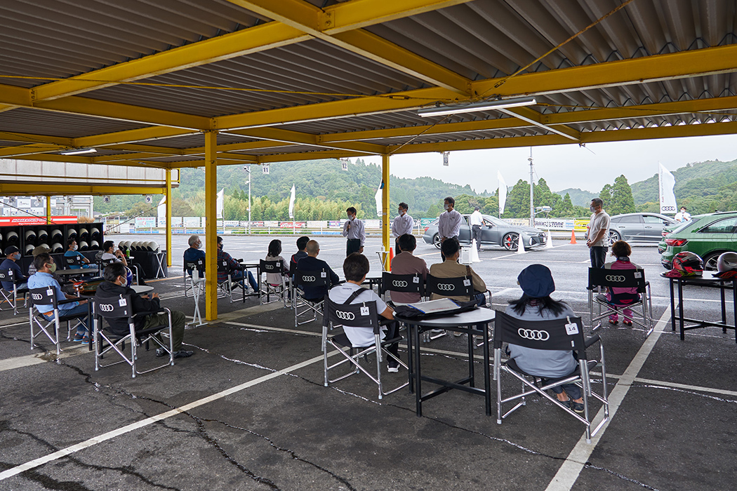簡単なオリエンテーションを行ったのち、参加者の皆さまは2グループに分かれ、いっぽうのグループはAudiのサーキット走行、もういっぽうのグループはレーシングカート走行を体験されることになります。そしてランチタイムを挟んで、午後はもうひとつのプログラムをご体験いただきます。両グループとも内容は同じで、体験される順番が異なるだけですが、ここでは、先にAudiのサーキット走行、続いてレーシングカートを体験された方を例にとって、当日の内容をご紹介いたします。