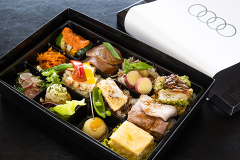 およそ3時間の走行を終えたところで昼休みとなります。今回は感染症予防の観点から、通常のケータリングではなく、お弁当をご用意させていただきました。ただし、お食事はミシュラン3つ星レストラン出身のシェフも在籍するフォリクラッセの謹製で、素材、味つけ、見ためまでこだわり抜かれたお料理。内容も13種類と豊富で、大満足のボリュームでした。