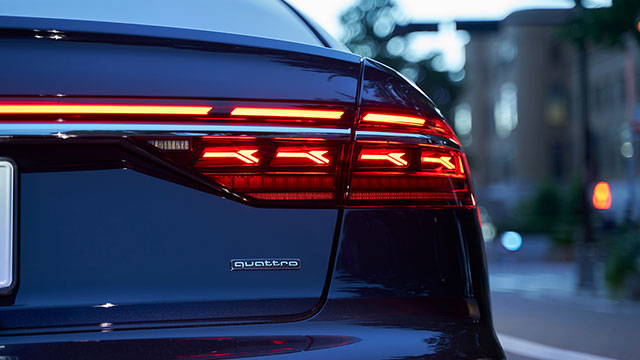 夜空に輝く星々のように、さまざまなライトが煌めく街。そのなかで、ひときわ気品のある存在感を放つのがAudi A8。陰影が深まる夜では、サイドのキャラクターラインからフロントグリルへと真っすぐと続くラインが、引き締まったボディをより際立たせます。街の灯りを受けた六角形のシングルフレームグリルは、きらりとした輝きとともに威厳を放ちます。見る人を高揚させるのは前だけではなく、後ろ姿からも。クロームのマテリアルに彩られたバンパーやスタイリッシュなOLEDのライティングデザインが相まって特別な存在に。細部までラグジュアリーな空気をまとうAudi A8で夜を過ごせば、毎夜ドライブへ繰り出したくなる日々となるでしょう。