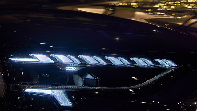 シャープなまなざしの中にAudiのフォーリングスを描かれたマトリクスLEDヘッドライト