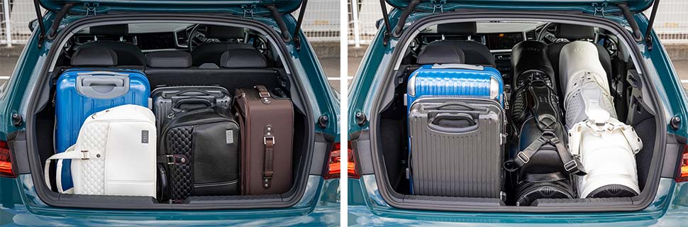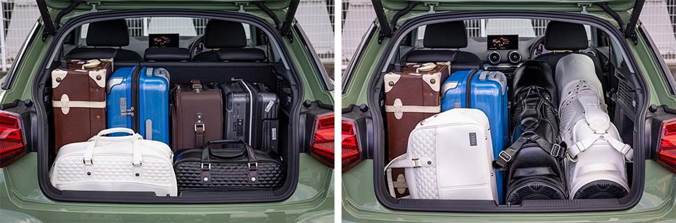 荷室に高さのあるAudi Q2のラゲッジスペースは405L。A3と同様の荷物が収まりながら、後部の視界も確保するなどまだ余裕のある状態に。さらにリアシートを片面倒しての収納もゴルフバッグを2つ横に並べて置くことができ、3人が座れるシートを確保しながら十分な収納力があることがわかります。