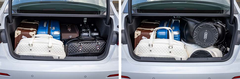 荷室が独立しながらシートを倒すことで居室空間も利用できるAudi A3 Sedanのラゲッジスペースは380L。大サイズのキャリーケースが2つと中サイズが2つ、さらにバッグも2つ収まりまだ余裕がある状態に。リアシートを片面倒せばゴルフバッグが縦に二つ並んで入り、さらに大きめのキャリーケースも2つ入るなど、見た目以上の収納力を発揮。