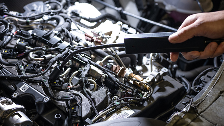 曽根:ガソリン・ディーゼルエンジンのインジェクター(インジェクションシステム)は、エンジンに接続され、空気に燃料を混ぜて効率よく供給する装置。この部分の不具合は前述のテスターでは状態の見極めが難しいため、人の手によるチェックが欠かせません。多くの経験を積んだ熟練のスタッフが集音マイクをインジェクター部分に当て実際の音を聞くことによりわずかな違和感も察知。走行で最も重要な役割を担うエンジンの状態が正常か、徹底的に確認しているのです。