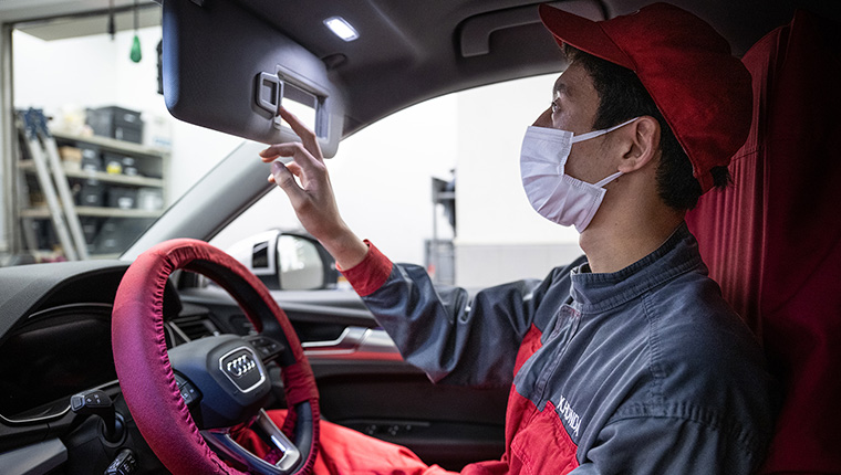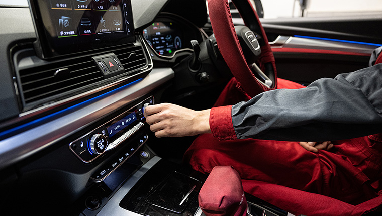 曽根:Audi正規ディーラーでの各種チェックはエクステリアや内部機構だけでなく、内部のボタンひとつに至るまで実施しています。たとえばエアコンを調整するダイヤルは正常にまわるか、サンバイザー部分に内蔵されたバニティミラーのライトは正常に発光するか、ドアの開閉音に違和感がないかなど、細部に渡って感触のテストも行うことでAudiがこだわり抜いている各種リアクションが正しく動作しているのかテクニシャンが隅々まで検査しているのです。
