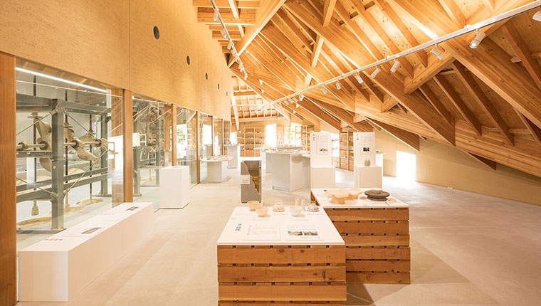 製土工場をはじめ、ギャラリーや工房など九谷焼にまつわる複合型の文化施設である九谷セラミック・ラボラトリー。九谷焼づくりに欠かせない磁器土を60年以上製造している工場では、製造過程の一部を見学できるほか、九谷焼の製造工程や新進作家の展示も楽しめるギャラリースペースがあります。30人規模の体験工房では、ろくろや手びねり、絵付けなど様々な体験メニューが用意されており、専門スタッフの指導のもと、誰でも参加可能です。また、若手作家が入居するレンタル工房もあり、新しい九谷焼文化を見学できます。施設の外土間からは、雄大な自然と田園風景を楽しむことができ、来館者の憩いの場として親しまれています。