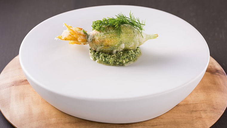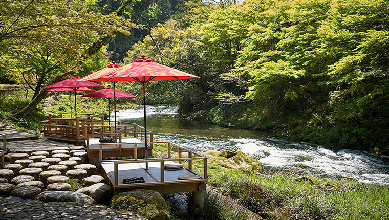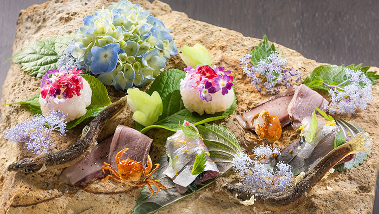 豊潤な食文化のもととなるのは、豊かな自然に育まれた観音山の名水です。この水を使って育った米や野菜、フルーツが味わい深いものとなるのは言うまでもありません。しかし、料理の魅力は食材だけではありません。県外からも美食家たちが訪れる理由には、糸井章太シェフの存在が大きいでしょう。糸井シェフは、日本最大級の料理人コンペティション「RED U-35」で史上最年少の26歳でグランプリを受賞して以来、ミシュランに比するフランスのレストランガイド『ゴ・エ・ミヨ2023』にて期待の若手シェフ賞を受賞するなど、世界でも注目を集める料理人です。今回の旅でいただいた11品のなかで最も印象深かったのが、観音下で採れる日華石の上に美しく盛り付けされた逸品。食材だけでなく、器までも地産のものを使われており、その徹底ぶりと美しさに心を奪われます。花ズッキーニと薄い衣で揚げられたイワナは、キュウリとバジル、青梅の塩漬けでブレンドされたソースによって、口の中で重層的な味わいが爽やかに広がります。季節の移ろいをよりいっそうと感じられるほど、手に入る食材のバリエーションが豊富で訪れるたびに新しい発見をもたらされるでしょう。