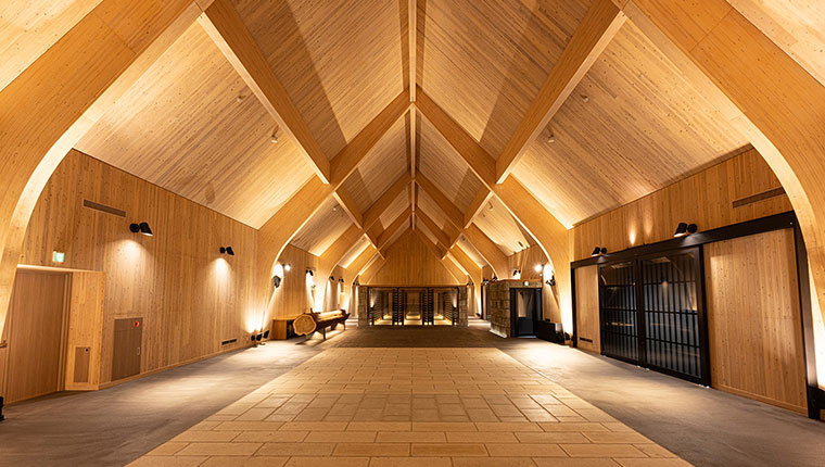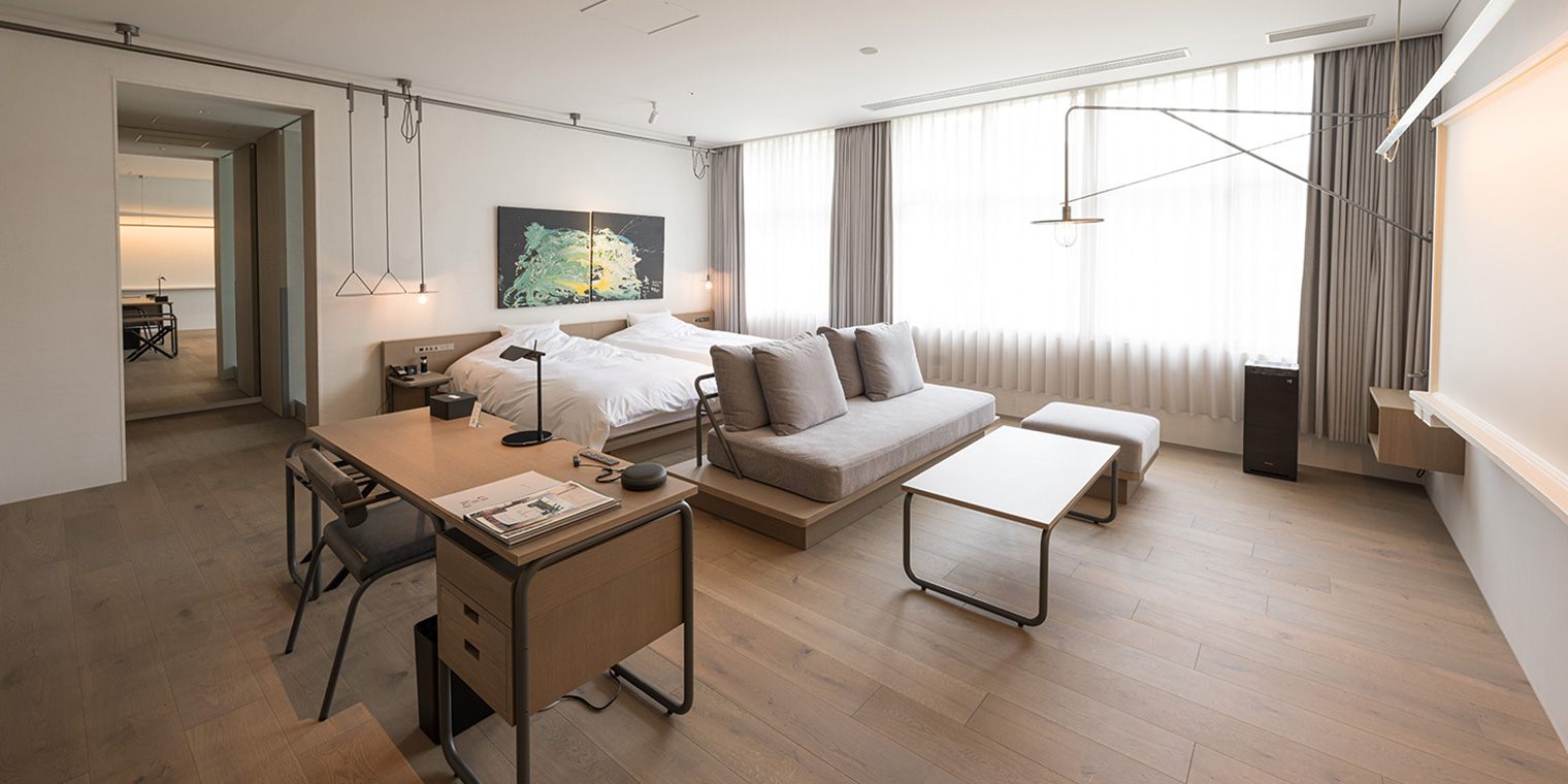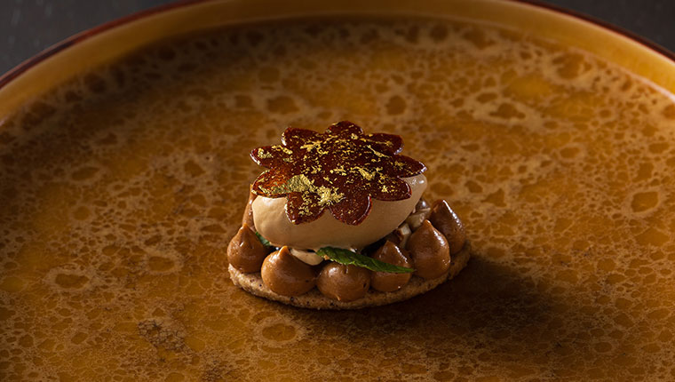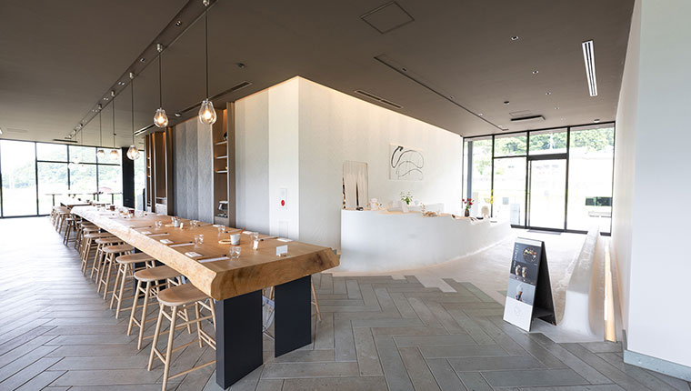 石川県小松市の中心から車で20分ほど山手に行くと、水芭蕉の自生地が今なお残る原風景の中に、ひっそりと旧西尾小学校が佇んでいます。平成30年に閉校となるまでの半世紀、地域の子どもたちを育み、見守り続けたこの廃校が、新たに生まれ変わったのが美食の宿「オーベルジュ オーフ」です。「オーベルジュ」とは宿泊施設を備えたレストラン。「オーフ」は、フランス語の水(eau)と火(feu)を合わせた造語(eaufeu)。豊かな自然が育んだ「水」と共に、この土地に新たな「火」を灯す、という想いが込められています。ここでの楽しみは食事だけでなく、館内随所に見られる空間美です。建物のシルエットや教室、黒板など、小学校のノスタルジックな面影を残しつつ、現代アートとの融合によって上質でモダンな世界観を醸し出しています。