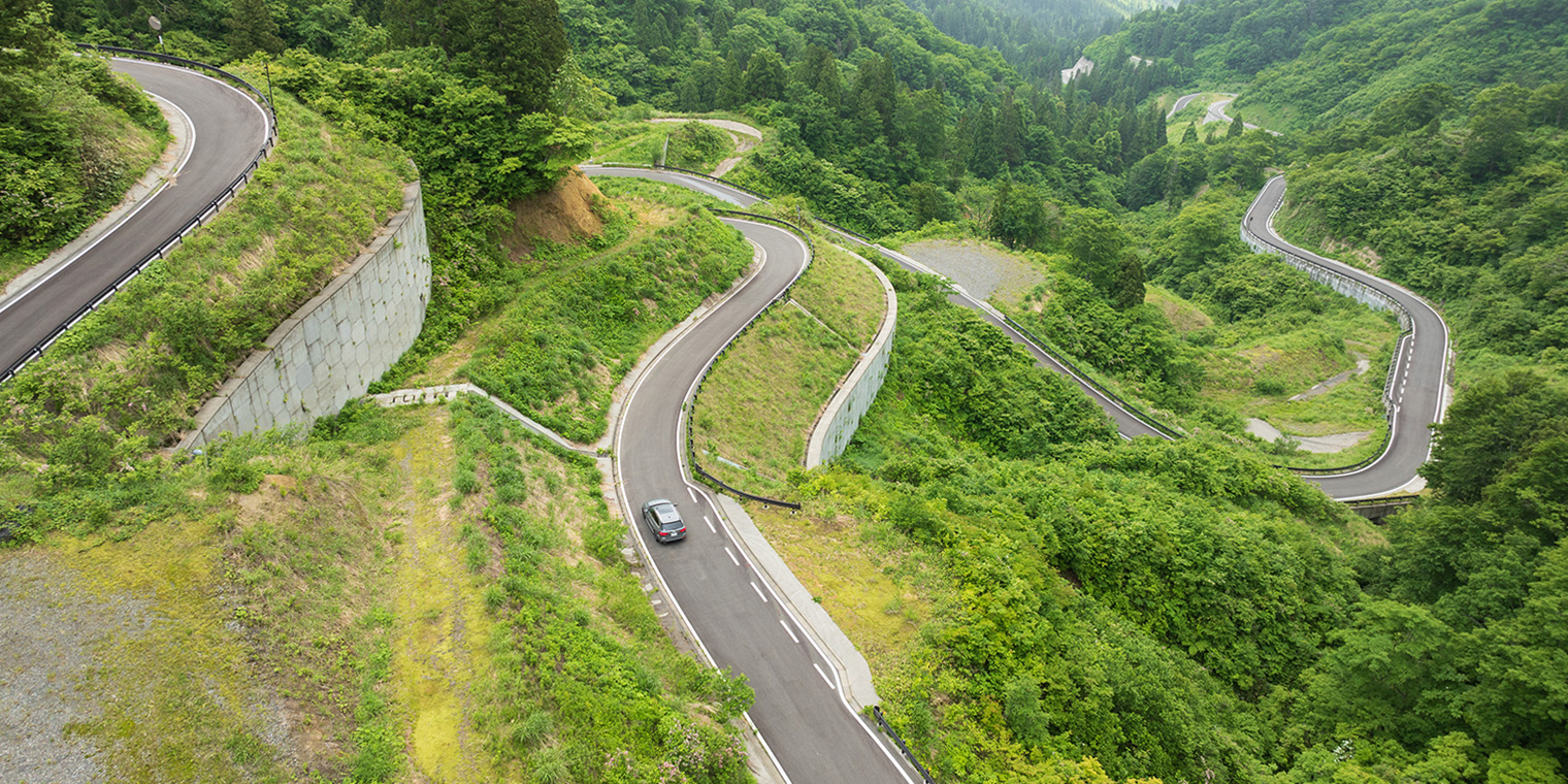 見渡すかぎり緑が広がり、木々が迫ってくるような新俣峠。そこには12年の年月をかけて整備され、2018年に開通した、小松から勝山までを結ぶ国道416号線があります。勝山市街を見下ろしながらくだる峠道は、高低差が大きく、ワインディングの醍醐味である車を操る楽しさを味わうのに相応しい道となっています。Audi S4 Avantの道路に吸い付くような安定感と、思いのままにライン取りできるハンドリングを堪能するのにぴったりのドライビングロードです。
