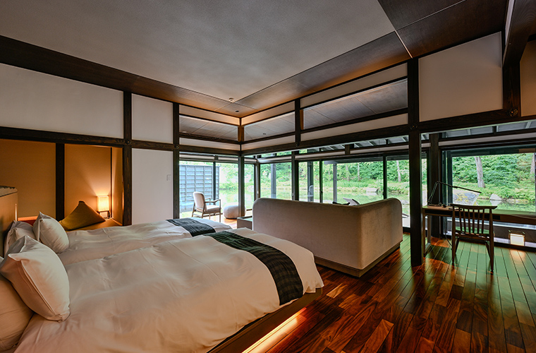 なかでも「ヴィラスイート」は、“暮らすように旅をする”をテーマに設計された、賛沢なプライベート空間です。歴史ある建材と現代的な快適性が見事に融合した唯一無二の魅力に浸かれば、時を忘れてしまいそう。太い梁が縦横に走り、雪の重みに耐えてきた堅牢な造りからは、歴史の重みが感じられます。大きく取られた窓は、和風建築の最大の特徴である“風景とのつながり”を存分に活かすもの。里山の風景 が切り取られ、光と風がやわらかく流れる開放的な空間を演出します。