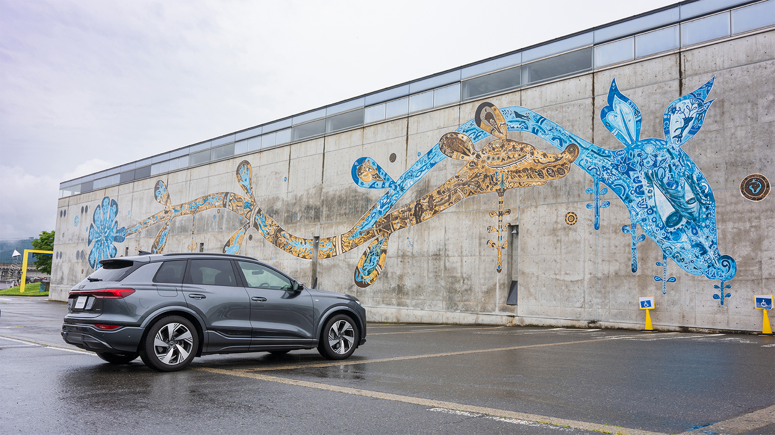 Audi Q6 e-tronを美術館の前に停めると、そのエクステリアデザインが周囲の景色と見事に調和していることに気づかされます。Audiの新しいEVデザイン言語を体現するAudi Q6 e-tronは、筋肉質なプロポーションと流れるようなルーフラインが特徴。無駄を削ぎ落としたシンプルな中に、Audiらしい洗練されたプレミアム感が凝縮されています。アート作品の一部であるかのように、MonETの空間に自然と溶け込むAudi Q6 e-tronの姿は、そのデザイン性の高さを改めて印象づけました。