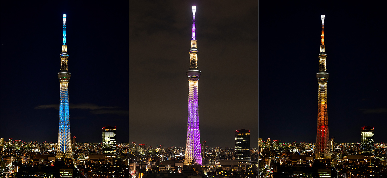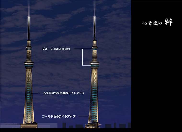 それが現在も東京スカイツリーのシンボルカラーとなっている、淡い青がきらめく「粋」と、紫色が輝く「雅」という日本の伝統文化を意識させる名前のついた2色でした。(後に元気なオレンジ色の「幟」が加わる)