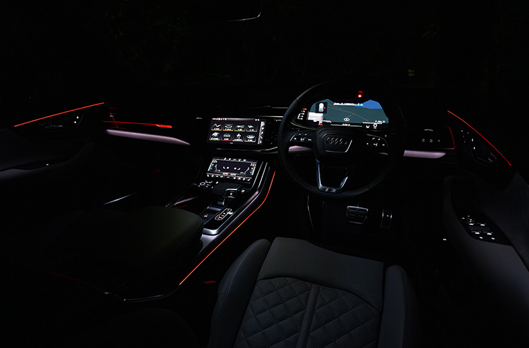 そして夜になれば、Audi SQ7は安らぎの空間へと変わります。マルチカラーアンビエントライティングが優しく照らす光の中でお気に入りの音楽に身を委ねれば、体の芯からリラックスすること間違いなし。漆黒の夜道を照らす先進的なライトは、どんな時も安全なドライビングをサポートします。