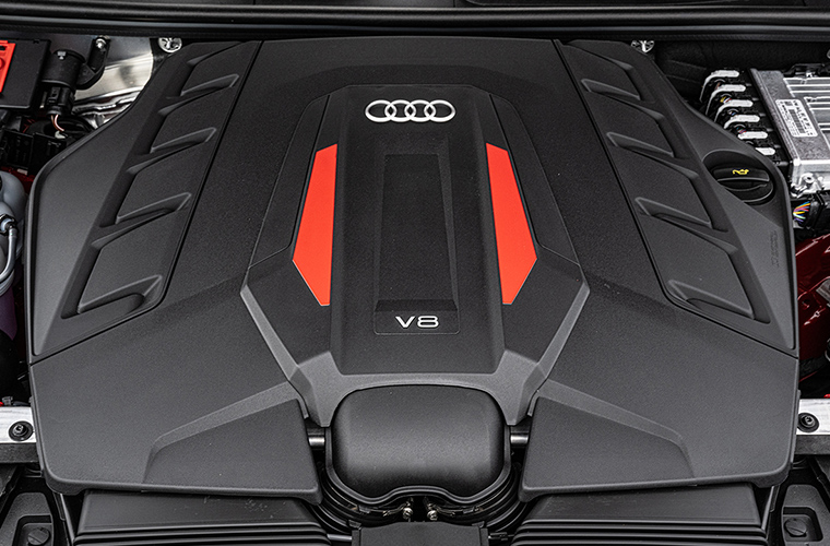 Audi SQ7の圧倒的な駆動力の源となるのが、最高出力373kW(507PS)および最大トルク770Nmを発揮するV型8気筒4.0ℓ TFSI直噴ガソリンエンジン。強大なパワーでわずかなアクセル操作にも俊敏に反応し、0-100km/h加速がわずか4.1秒という瞬発力は驚異的な数値です。
